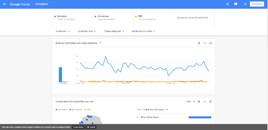 Google Trends est clairement un outil issu du Big data, vous savez cette masse de données que collectent les entreprises. Il permet essentiellement deux choses, analyser les recherches des internautes pour identifier les tendances et comparer les différents mots-clés être eux. Seul bémol, si vos recherches sont trop précises et dans une zone géographique trop restreinte il est fort probable que les données ne soient pas remontées. Dernière info sur cet outil, le chiffre 100 sur votre graphique n'indique pas le nombre de recherches effectuées par les internautes mais correspond plutôt au pic maximum, ainsi vous avez une échelle de 0 à 100 et visualisez une variation, pas un nombre réel.