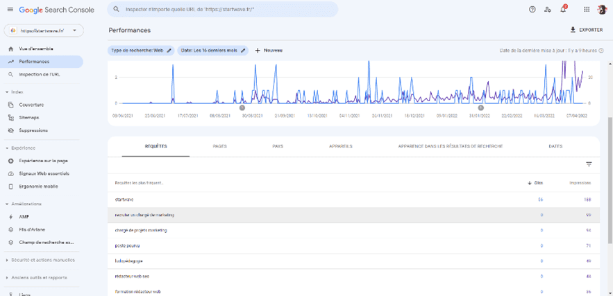 Google Search Console est l'outil de prédilection de tout référenceur qui se respecte. En effet, il permet de savoir quels mots-clés les internautes ont recherchés pour arriver sur vos pages web, à quelle position vous êtes arrivés dans les SERPs et quel est le pourcentage de personnes ayant cliqués sur votre site dans les résultats.