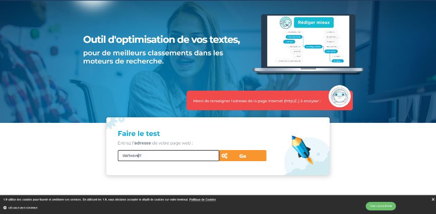 Il s’agit d’un assistant d’écriture qui permet d’optimiser vos textes dans l’objectif de gagner des positions sur les moteurs de recherche. Il vous suffit pour cela d’entrée l’URL de votre site et de suivre les conseils proposés. Bien sûr, nous vous conseillons de faire le test avec une page d'un concurrent qui est très bien positionné sur une requête que vous convoitez. La particularité de ce petit outil est qu'il scanne votre page comme le ferait le robot d'indexation de Google et va en dégager les trois champs sémantiques qu'il comprend, tout en suggérant des mots manquants. Idéal pour chercher des mots-clés mais aussi plus tard pour tester le contenu que vous aurez rédigé.