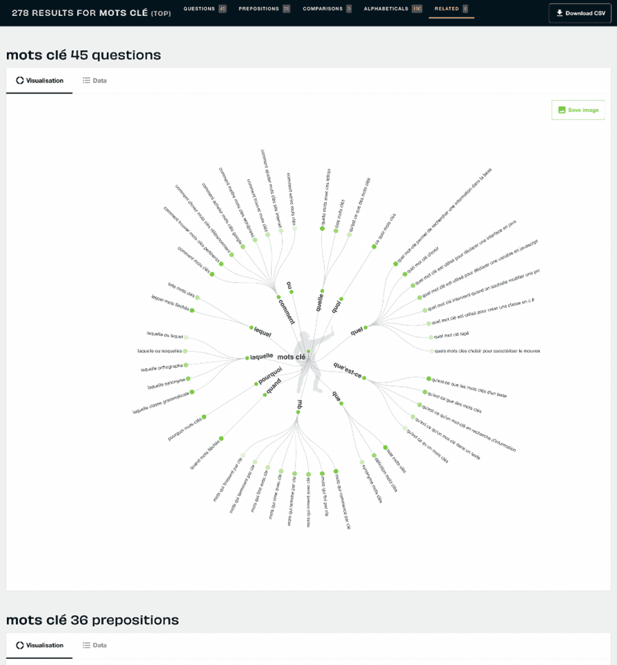 Il s’agit d’un générateur de questions et d’associations d’idées qui reprend les autosuggestions de Google et de Bing. Il récupère les recherches les plus populaires des internautes et en propose une longue liste à partir de requête ou de mot-clé. Avec son format carte mentale très visuel vous brossez ainsi tout le champ sémantique autour d'un mot clé. Attention cependant, vous n'avez le droit qu'à une chance par jour, choisissez bien vos mots-clés et surtout pas plus de deux dans une requête.