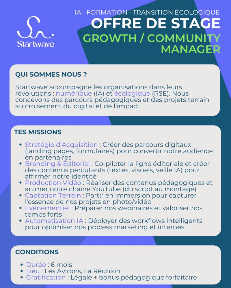 Envoie ton CV et quelques lignes sur ce qui te motive à contact@startwave.fr Objet : Candidature Stage Growth/Community Manager – Startwave